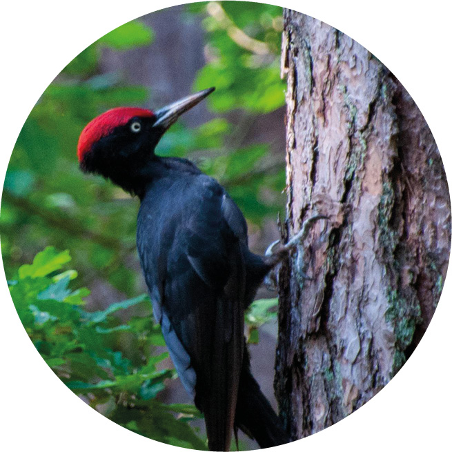 Der Schwarzspecht ist der größte Specht in unseren Breiten und misst bis zu 50 cm. Er ist sehr eng an alte Baumbestände gebunden. Darin baut er seine Brut- und Schlafhöhlen 30 bis 55 cm tief. Viele gefährdete Höhlenbrüter wie Hohltaube, Dohle, Rauhfußkauz, ja auch Fledermäuse und Wildbienen benötigen wiederum genau diese Höhlen für ihre Fortpflanzung und sind typische „Nachmieter“ der Spechte.