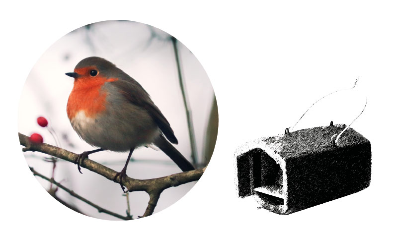 Rotkehlchen, Grauschnäpper, Zaunkönig und Amsel suchen Halbhöhlenkästen auf, um ihre Brut geschützt vor Elster oder Eichelhäher aufzuziehen.